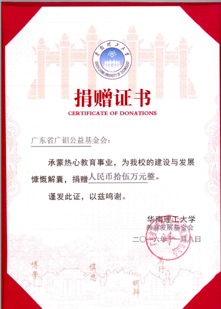 11月8日,廣鋁公益基金會(huì)繼續(xù)向華南理工大學(xué)捐贈(zèng)人民幣15萬(wàn)元,用于資助材料科學(xué)與工程學(xué)院、機(jī)械與汽車(chē)工程學(xué)院、經(jīng)濟(jì)與貿(mào)易學(xué)院和設(shè)計(jì)學(xué)院等學(xué)院品學(xué)兼優(yōu)的家庭經(jīng)濟(jì)困難學(xué)生,共資助30人,每人5000元。基金會(huì)對(duì)所資助的大學(xué)生寄予了厚望,希望每個(gè)被資助的學(xué)生自強(qiáng)不息、努力學(xué)習(xí)、早日成才,希望同學(xué)們要常懷感恩之心,傳遞愛(ài)心、回報(bào)社會(huì),用身體力行回饋社會(huì)、幫助他人,在奉獻(xiàn)社會(huì)中實(shí)現(xiàn)人生更大的價(jià)值。