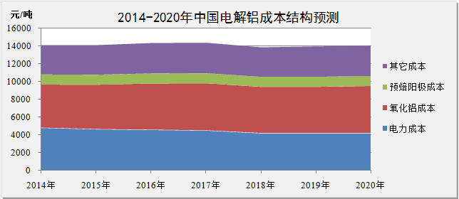 加權(quán)成本結(jié)構(gòu)。2014年我國(guó)氧化鋁生產(chǎn)成本主要由氧化鋁、電力及預(yù)焙陽(yáng)極三個(gè)方面構(gòu)成。其中,氧化鋁成本為4846.4元/噸,占比34.4%;電力成本為4809元/噸,占比34.1%;預(yù)焙陽(yáng)極成本為1169.6元/噸,占比8.3%。研究預(yù)測(cè),2015-2020年期間氧化鋁成本占比將逐步提升至37.7%,電力成本占比將逐步下降至29.9%,預(yù)焙陽(yáng)極成本占比穩(wěn)定。