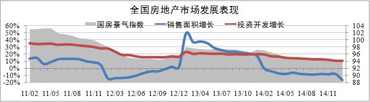 發稿時間:2015-04-07根據國家統計局統計,2015年2月國房景氣指數繼續回落至93.77,房地產投資開發增速及銷售面積增速均創造了2011年以來的歷史新低。其中,房地產投資開發增速跌至10.4%,跌幅環比持平;全國商品房銷售面積增速下跌16.3%,跌幅環比增加近10個百分點,隨著國家定向量化寬松政策的進一步明細,預計房地產投資開發增速仍將繼續回落,銷售市場有望平緩回升。
