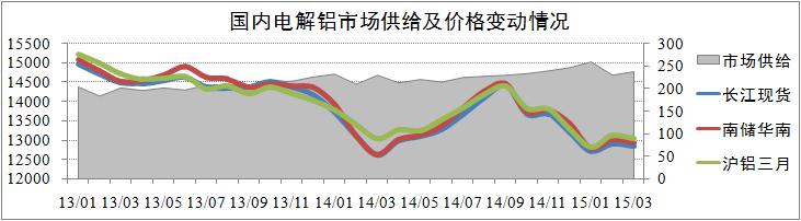 自2014年9月份全國鋁價出現高位回落以來,今年前三月份鋁價基本在12800元/噸-13100元/噸的區間內波動。市場供給方面,2015年1-2月全國產量分別為262萬噸和232萬噸,同比增長率約為8%,市場供給并未出現實質性的縮減。目前,全國電解鋁市場價格已整體逼近2013年以來的最低水平,預計上半年將進一步跌破至12500元/噸關口,下半年鋁價將出現整體回升。