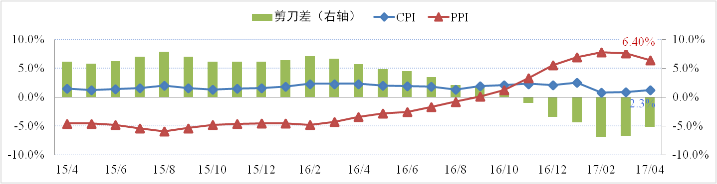 4月份CPI同比上漲1.2%,環(huán)比上漲0.1%;PPI同比上漲6.4%,環(huán)比回落0.4%。CPI連續(xù)兩個(gè)月回升,PPI連續(xù)兩個(gè)月回落,“剪刀差”進(jìn)一步收窄,物價(jià)形勢(shì)總體平穩(wěn)。PPI漲幅回落主要受補(bǔ)庫(kù)存接近尾聲、需求收縮、大宗商品價(jià)格下跌以及去年低基數(shù)效應(yīng)影響。