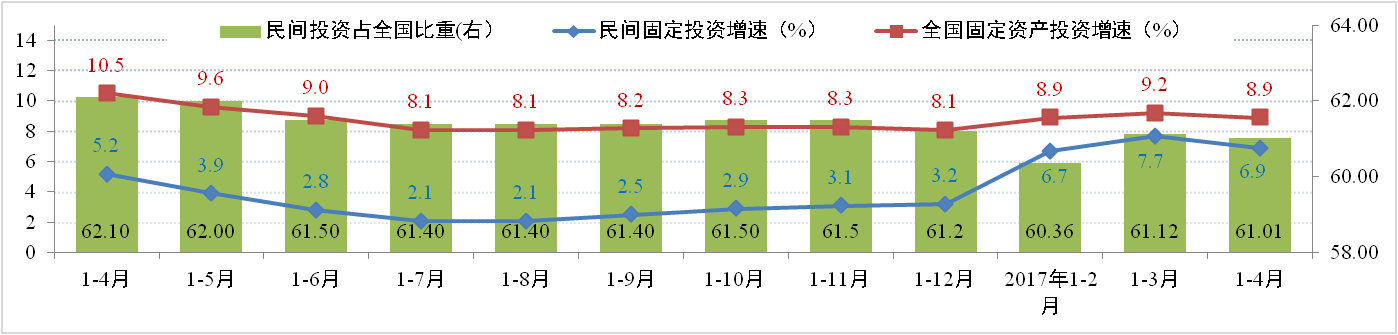 據(jù)國(guó)家統(tǒng)計(jì)局統(tǒng)計(jì)數(shù)據(jù)顯示,2017年1-4月全國(guó)固定資產(chǎn)投資(不含農(nóng)戶)14.43萬(wàn)億元,同比增長(zhǎng)8.9%,增速比一季度低0.3個(gè)百分點(diǎn)。其中全國(guó)民間固定資產(chǎn)投資8.8萬(wàn)億元,同比增長(zhǎng)6.9%,增速比1-3月份低0.8個(gè)百分點(diǎn)。民間固定資產(chǎn)投資占全國(guó)固定資產(chǎn)投資(不含農(nóng)戶)的比重為61%。