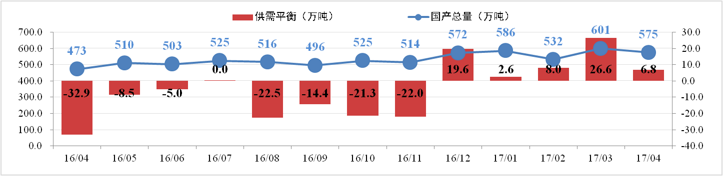 據行業統計數據,目前全國氧化鋁總產能為7723萬噸,開工產能7071萬噸,開工率91.56%。4月份氧化鋁產量約575萬噸,同比增加17.2%。減復產方面,中鋁河南80萬噸置換產能逐步投產;中鋁山西、中鋁中州、中鋁遵義分別減產80萬噸、25萬噸和30萬噸產能;三門峽義翔60萬噸產能減產檢修。4月份國內氧化鋁供給存在約6.8萬噸的過剩。