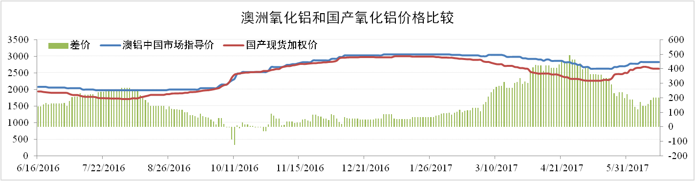 國(guó)際方面,6月16日澳鋁中國(guó)市場(chǎng)指導(dǎo)價(jià)為2825元/噸,同比上漲7.62%。國(guó)產(chǎn)氧化鋁與澳洲進(jìn)口氧化鋁價(jià)差縮小至186元/噸,氧化鋁進(jìn)口窗口逐步打開(kāi)。國(guó)內(nèi)氧化鋁價(jià)格大漲以及進(jìn)口氧化鋁需求提高,澳鋁指導(dǎo)價(jià)跟隨國(guó)內(nèi)價(jià)格表現(xiàn)堅(jiān)挺。