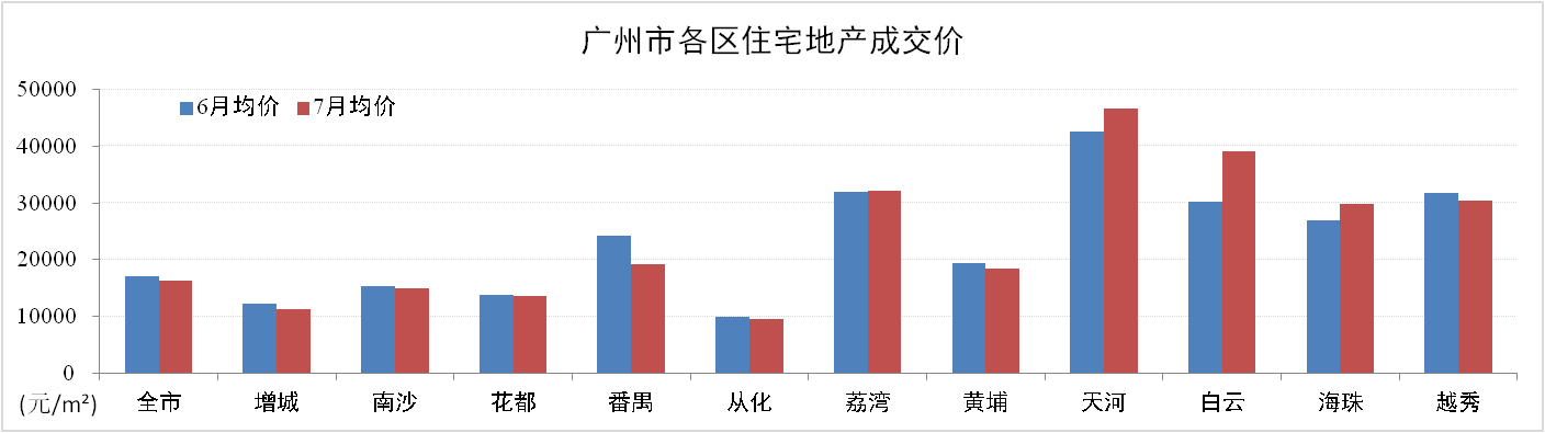 成交價方面:7月份廣州一手住宅成交均價為16,289元/m2,環(huán)比下跌1.65%。其中,增城成交均價為11,302元/m2,環(huán)比下跌7.67%。天河區(qū)、白云區(qū)、海珠區(qū)成交均價有所上升,其中白云上升29.69%。