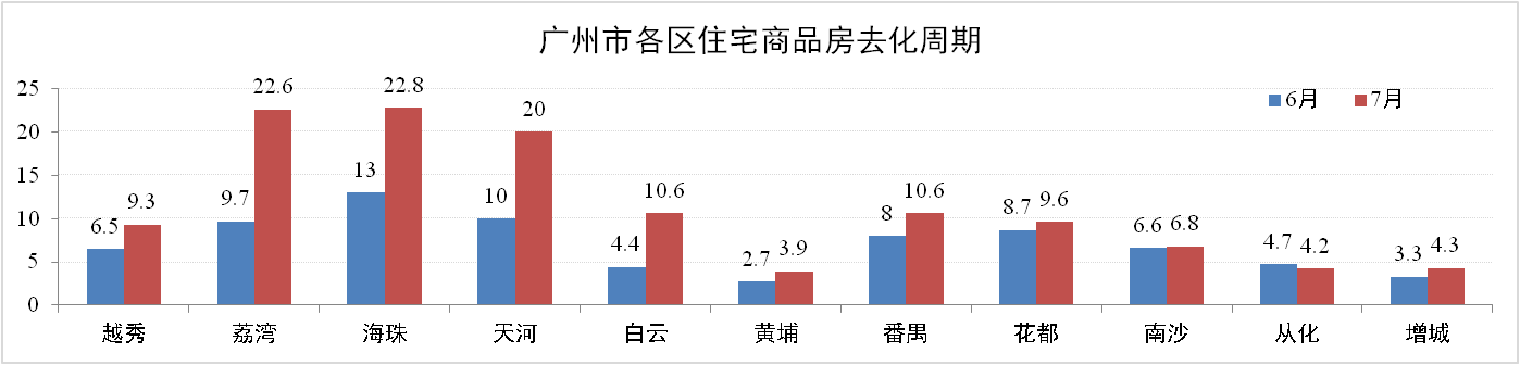 截至7月底,由于近期成交量回落,廣州住宅地產(chǎn)去化周期上升至7.2個月,總體庫存量為643.54萬㎡。其中,海珠、荔灣、天河三區(qū)去化周期明顯上升,荔灣區(qū)為22.8個月,居于全市首位。而黃埔、增城等區(qū)因價格相對較低,剛需較強,去化周期僅剩4個月左右。