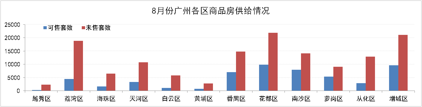8月31日,廣州市新建住宅商品房共194,949套,環比上升3.1%,其中:可售住宅商品房為54,104套,占比27.75%;未售住宅商品房140,845套,占比72.25%?;ǘ?、增城、番禺、南沙庫存量較高,可售和未售房源累計占全市比例分別為63.73%和51.13% 。