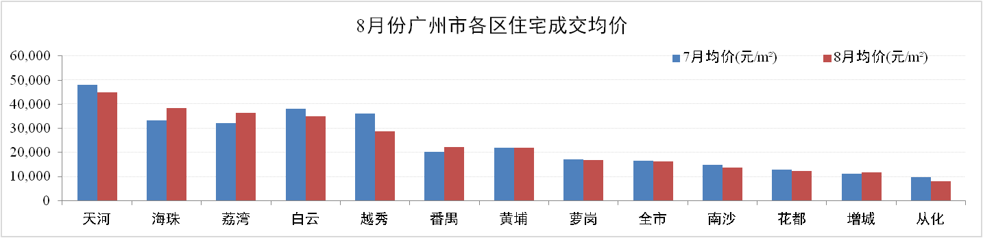 成交價方面:8月份廣州一手住宅成交均價16,313元/m2,環比下跌1.99%。其中,增城成交均價為11,617元/m2,環比上升3.03%。除海珠、荔灣、番禺及增城保持增長外,其他區域成交均價均錄得不同程度下跌,其中越秀跌幅達20.63%。