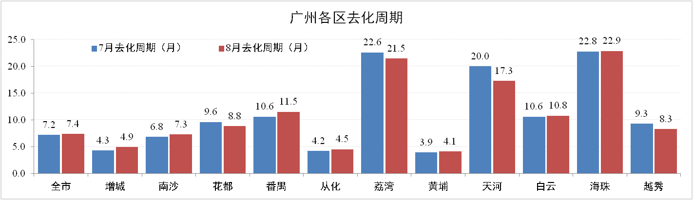 8月份廣州住宅地產去化率達86.6%,去化周期環比增加0.2個月為7.4個月。其中,增城、南海、番禺三區去化周期有所上升。但由于外圍地區剛需強勁,增城、從化、黃埔等保持低去化周期,增城去化周期僅為4.3個月。
