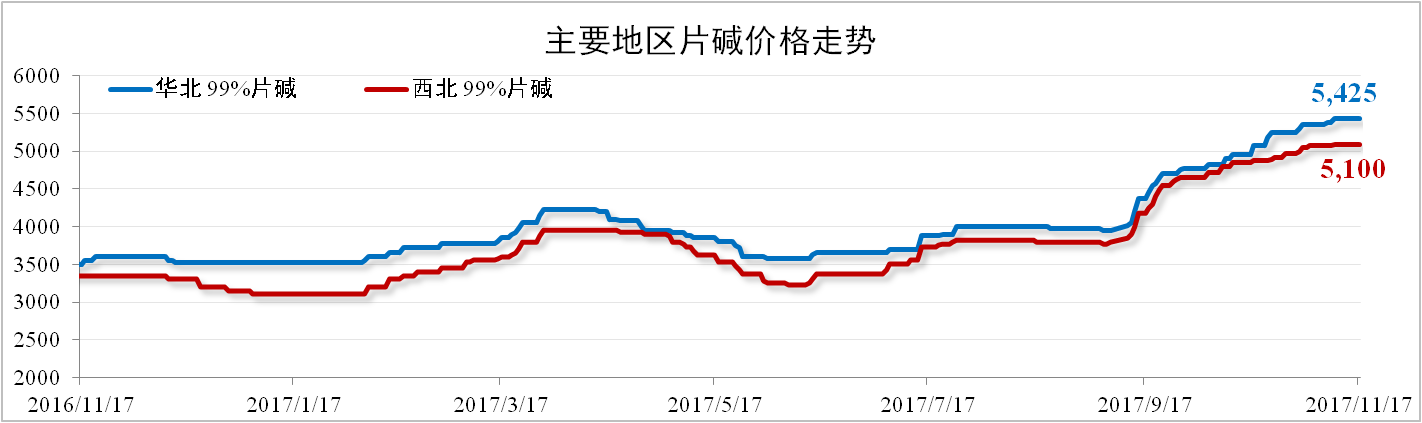 10月片堿庫存水平保持低位,片堿企業預售11月訂單,導致片堿報價維持高位。截至11月17日,華北地區99%片堿報價5,425元/噸,環比上漲11%;西北地區99%片堿報價5,100元/噸,環比上漲6% 。