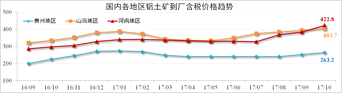 受十九大、環保稽查以及氧化鋁需求旺盛的影響,10月份鋁土礦供應緊缺加劇,價格不斷上揚。其中,貴州(AL:60%,A/S:5.5-6.5)礦石含稅價達到263.2元/噸,環比上漲4.69%;河南地區報422.8元/噸,環比上漲10.31%。