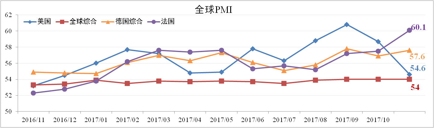 據市場調查機構IHS Markit數據顯示,11月全球綜合PMI為54,持平于上月。發達國家表現有所分化,其中美國綜合PMI下滑至54.6,德國、法國綜合PMI則分別上揚至57.6、60.1。