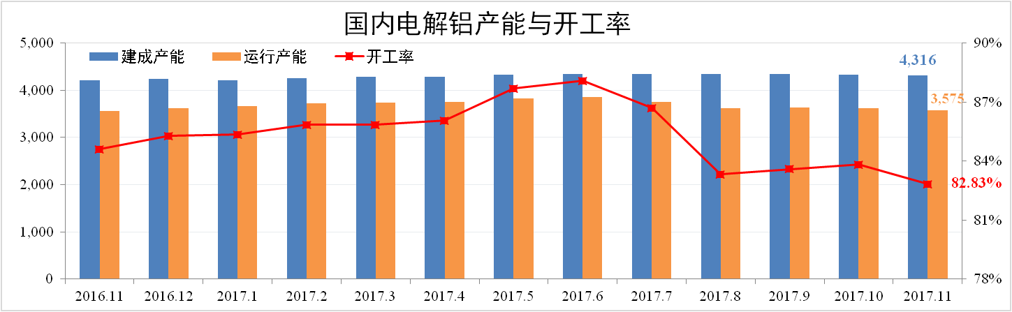11月份中國電解鋁總產能4,316萬噸,運行產能3,575萬噸,開工率82.83%,其中運行產能環比下降1.4%。據百川資訊統計,截至12月7日,2017年中國電解鋁累計已減產494.8萬噸,已確定待減產19.7萬噸,年內累計已復產143.8萬噸。
