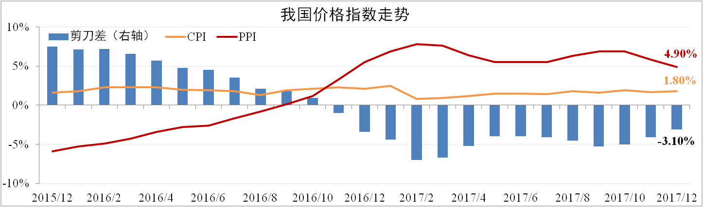 12月我國CPI同比增長1.8%,較上月擴大0.1個百分點,CPI年度漲幅為1.6%。PPI同比上漲4.9%,較上月下滑0.9個百分點,PPI年度漲幅為6.3%。