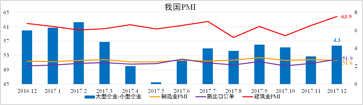 12月我國制造業PMI為51.6,較上月下滑0.2個百分點。其中,出口訂單繼續上升至51.9,顯示外需保持強勢;大企業與小企業之差有所擴大,表明在環保壓力下大型企業達標能力強;另外,建筑業意外錄得63.9的高位。