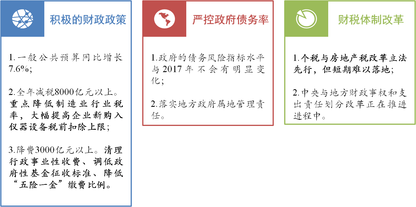 分析認為:地方政府專項債、中央基建投資分別較2017年增加5500億、300億元,因此今年財政政策較去年只強不弱。另外減稅降費將進一步降低企業(yè)稅負,提高企業(yè)競爭力,釋放市場活力。