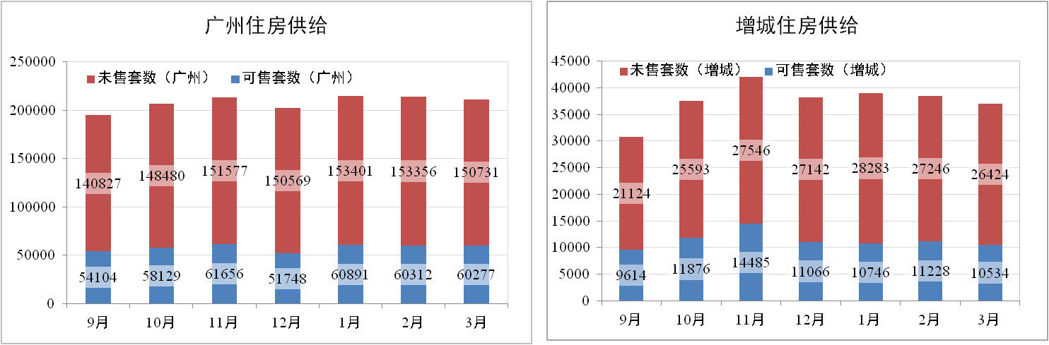 3月31日,廣州市新建住宅商品房供應共150,731套,環比下降1.7%。其中可售住宅商品房為60,277套,占40%,與2月持平。
