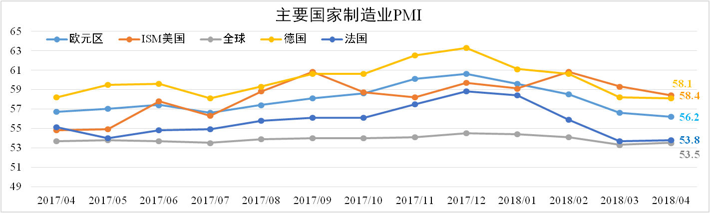 全球經濟景氣度有所回升。據IHS與摩根數據顯示,4月份全球制造業PMI為53.5,較上月擴大0.2個百分點。其中,4月份ISM美國制造業PMI為57.3,較上月大幅收縮0.9個百分點,德國下滑0.1個百分點至58.1,整體平穩。