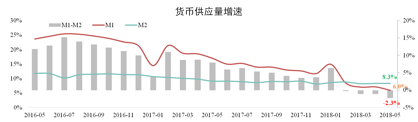 發稿時間:2018-06-22據人民銀行數據,5月份M1增速為6.0%,較上月下降2.3個百分點,創兩年新低。M2增速為8.3%,與上月持平。剪刀差為-2.3%,連續4個月為負,說明貨幣活力有所下降,實體經濟流動性偏緊。