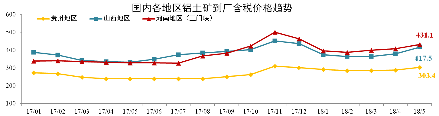 發(fā)稿時(shí)間:2018-06-225月份各地鋁土礦價(jià)格均小幅度增長(zhǎng)。截止2018年5月,貴州(AL:60%,A/S:5.5-6)到廠含稅價(jià)月均價(jià)303.4元/噸,環(huán)比上漲5.16%;山西鋁土礦417.5元/噸,環(huán)比上漲9.87%;河南鋁土礦431.1元/噸,環(huán)比上漲5.58%。
