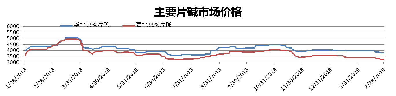 2月份國內片堿的總體成交有所下降,市場整體走勢繼續下行。截止到2月28日,西北99%片堿市場價為3225元/噸,環比下降3.42%;華北99%片堿市場價為3775元/噸,環比下降1.79%。