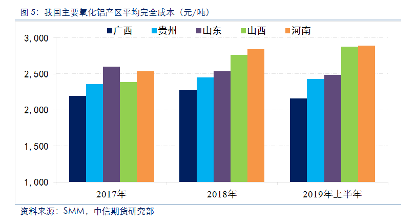 海關數據顯示,2014年以來,我國鋁土礦進口保持穩步增長。2018年,我國氧化鋁產量約為7200萬噸,鋁土礦產量約1億噸,2018年全國進口鋁土礦約占國內礦石總供應量的42%。海外礦石因儲量豐富、開采成本低、礦石品位較高等優勢逐漸受到國內氧化鋁企業的青睞,另外,隨著山西地區資源過度開采,鋁土礦品位下降,山西政府有保護省內資源的意愿,預計該地區礦石開采將繼續受到限制,進口礦使用將逐漸成為主流。