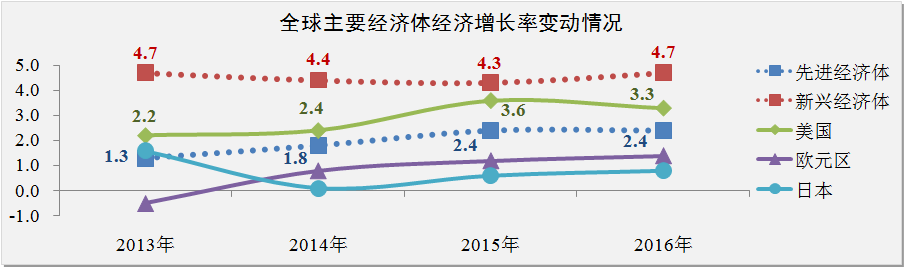 國際貨幣基金組織(IMF)在2015年全球經(jīng)濟(jì)發(fā)展展望預(yù)測報告中指出,目前全球經(jīng)濟(jì)呈現(xiàn)出四個趨勢:一是石油價格自去年9月份以來下跌近55%;二是全球經(jīng)濟(jì)增長基本符合預(yù)期,但主要經(jīng)濟(jì)體增長情況存在顯著差異;三是美元退出QE后幣值上升近6%;四是新興經(jīng)濟(jì)體的利率及風(fēng)險利差逐步上升。IMF預(yù)計2015-2016年全球經(jīng)濟(jì)增長率分別為3.5%和3.7%。相比2014年10月期《世界經(jīng)濟(jì)展望》的預(yù)測,IMF對全球經(jīng)濟(jì)增長率下調(diào)了0.3個百分點(diǎn)。之所以做出這種調(diào)整,是因為對中國、俄羅斯、歐元區(qū)和日本經(jīng)濟(jì)前景做出了重新評估。應(yīng)引起注意的是,美國是唯一增長預(yù)測上調(diào)的主要經(jīng)濟(jì)體。