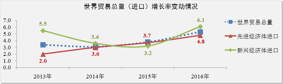 IMF數(shù)據(jù)顯示,2015-2016年世界貿(mào)易總量(貨物和服務(wù))將會出現(xiàn)較快增長趨勢,增長率分別為3.8%和5.3%。受石油價格及大宗商品價格下跌對貿(mào)易條件和實際收入的負(fù)面影響,預(yù)計2015年新興經(jīng)濟(jì)體對世界貿(mào)易增長的貢獻(xiàn)將低于先進(jìn)經(jīng)濟(jì)體,增長率為3.2%。隨著負(fù)面影響逐步化解,預(yù)計2016年新興經(jīng)濟(jì)體的貿(mào)易增長率將快速回升至6.1%。