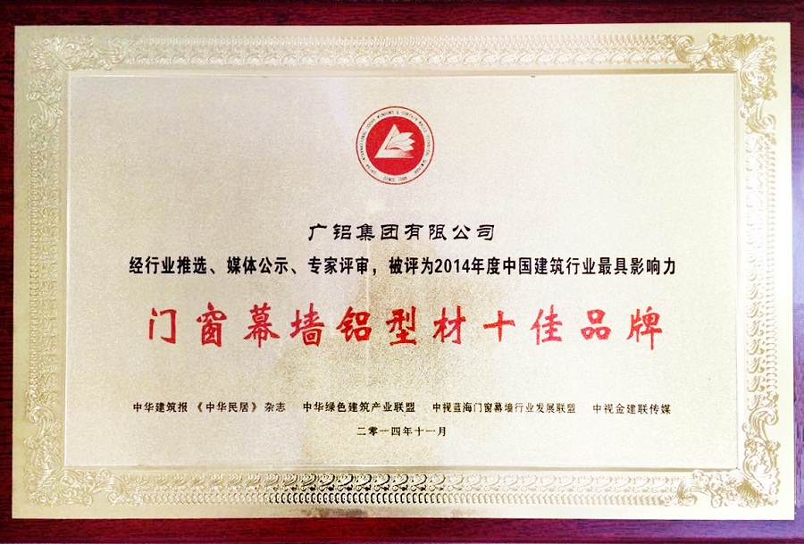 Post time:2015-01-02After more than three months, the list of the most influential “Top Ten Brands of Aluminum Profile for Door, Window and Curtain Wall” in Chinese construction industry of 2014, has finally came out in November. Galuminium Group received this honor by its strong comprehensive strength and market impact.
